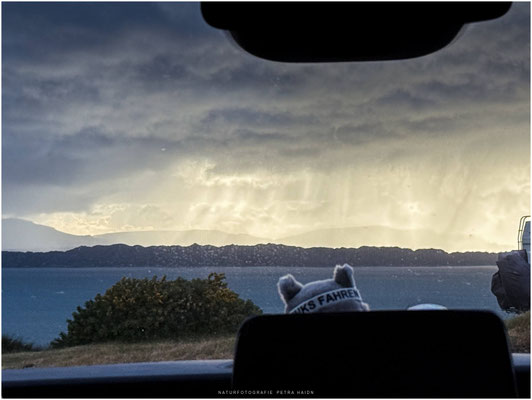 Jedoch kündigte sich für die Nacht starker Sturm an (der vom Westen und den vorgelagerten Inseln an die Küste zieht) und so war vorsichtshalber nochmal Stellplatzwechsel angesagt. Weg von dem Aussichtsplatz und um die Kurve rum in eine ruhigere Ecke. Was sich nachträglich als sehr weise rausstellte.