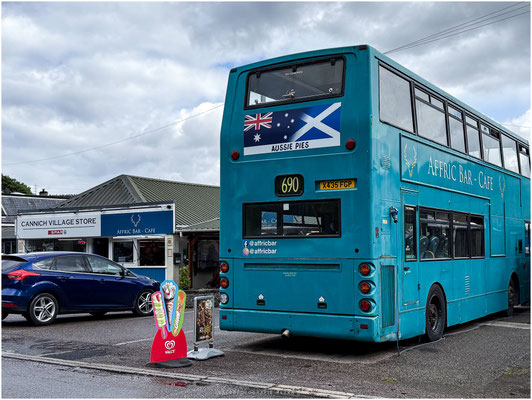 Nach einiger Zeit sind wir geflüchtet und zum Kaffee-Stopp in die Affric Bar (einem umgebauten Doppeldeckerbus) und einen kleinen Supermarkt am Rande des Parks aufgebrochen. Die vorhandene Whisky Auswahl war sehr beeindruckend und für jeden Whisky-Liebhaber müsste was dabei sein. Aber so schnell wollten wir die Region nicht aufgeben. Also nochmal über die holprige single-lane Straße zurück in den Park auf den bewährten Platz. Von einem jungen Schotten bekamen wir noch einen Tipp gegen die Midges im Bus. Räucherstäbchen mit Citronella. Oha, das hatte bisher noch keiner gesagt. Er war sogar so nett uns einige aus seinem Vorrat zu geben. Damit hatten wir eine „spezielle Geruchsmischung“ im Bus. Pizzaduft (es gab Reste vom Vortag) und Räucherstäbchen.