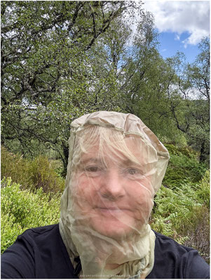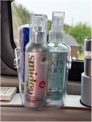 Ab jetzt ist unser Anti-Midge-Equipment immer griffbereit: Mückenlampe, Smidge-Spray und Skin-Soft-Spray, Citronella-Kerze. Thermacell (ökologisch fragwürdig) darf nur im Freien verwendet werden.