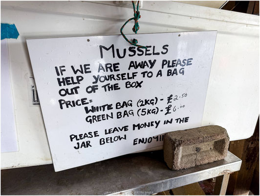 Im Augenwinkel erspähte ich im Vorbeifahren ein kleines Schild: „frische Muscheln“. Also Ausweiche suchen und umdrehen. Am Strand war eine kleine Muschelfarm mit angrenzenden „Laden“. Genauer gesagt einer Tiefkühltruhe aus der man sackweise frische Muscheln kaufen konnte. Na das klang doch perfekt. Das ganz Kleingeld (ja zwischendurch braucht man auch mal Münzen) zusammengesucht und in die „honesty box“ geworfen. Dafür gab es dann 2 kg frische Muscheln.