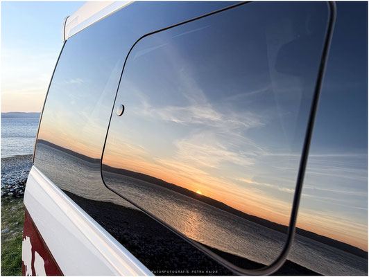 Um die Fahrt erträglicher zu machen und zwischendurch die Füße zu vertreten habe ich Pausen vorgesehen, natürlich nicht ohne den Hintergedanken dort fotografieren zu gehen. Spät nachmittags erreichten wir also einen ruhigen Stellplatz direkt an einem kleinen See. Nur noch 2 weitere Camper waren da. Nicht auszudenken was hier in der Hochsaison los sein muss.