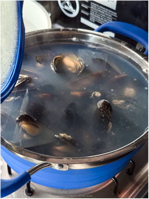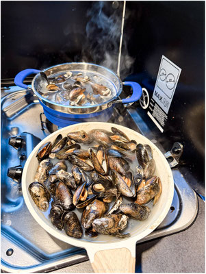 Also dann halt kochen. Wir hatten noch unsere Muscheln im Kühlschrank und die mussten jetzt weg. Wie bereits bewährt kochte ich auf 2 x. Das funktioniert hervorragend. Einfach mal die Pfanne und Topf gleichzeitig einsetzen.