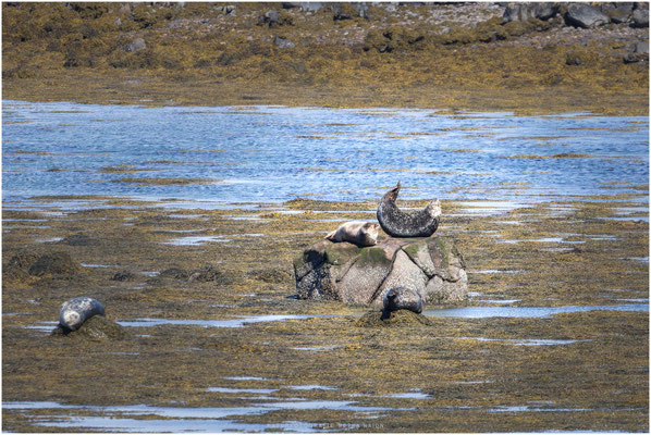 Ich Gas abgedreht, Kamera raus aus dem Rucksack, Tele dran und dann…. Nix – nix zu sehen, doch dann….von wegen Delphine. Robben waren es. Mindestens 40 Stück. Mist, 400’er Tele zu kurz und mit Konverter wird’s nicht wirklich klar. Aber besser als nix. Die Robben sonnten sich auf einer kleinen Insel und genossen die seichte Bucht zum plantschen.