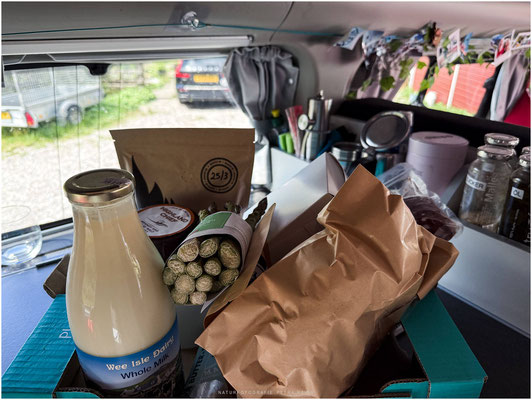 Am nächsten Morgen regnete es bei 11 Grad immer noch und die tiefhängenden Wolken verführten uns auch nicht zu einer Wanderung mit Fernblick. Die Wettervorhersage versprach bessere Bedingungen an der Küste. Na gut, dann wieder ab zur Küste in Richtung Isle of Skye. An einem kleinen Hofladen entlang der Strecke ergänzten wir unsere Vorräte. Es gab sogar endlich mal wieder leckeres selbstgebackenes Sauerteigbrot.